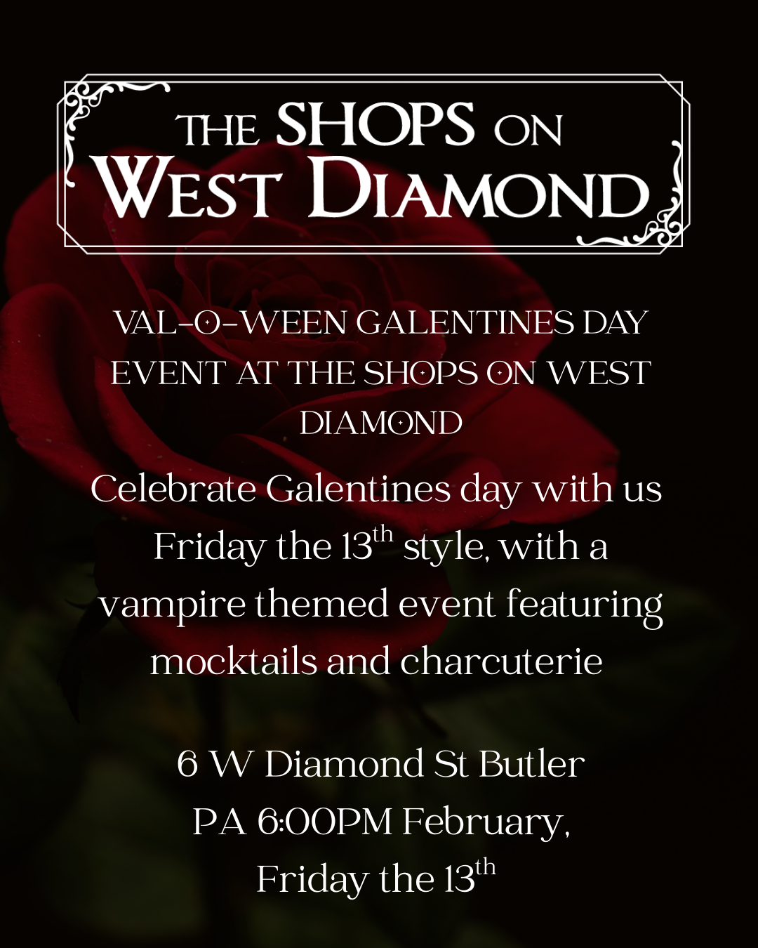 Join us for a darkly delightful Galentine’s Day Vampire Val-o-ween Party at The Shops on West Diamond.